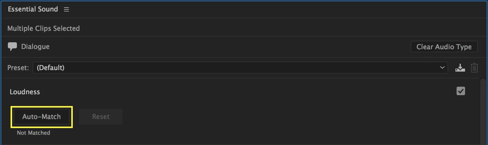 What exactly is the Auto-Match button matching to? Is it matching the clips to themselves, like tuning a guitar to itself? No, the Loudness Auto-Match button adjusts the clip audio levels to a preset target loudness, measured in LUFS, depending on the audio type. The Essential Sound panel only displays the target loudness after clicking Auto-Match.