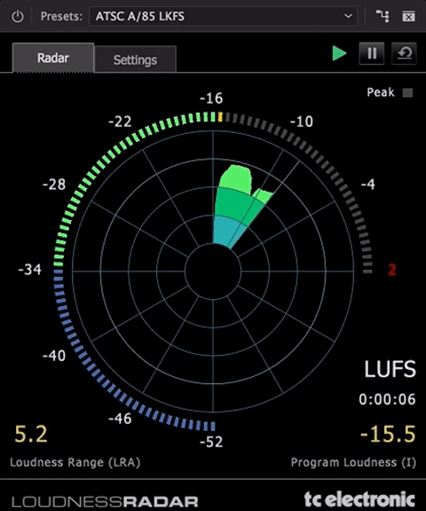 We know that -16 LUFS is a suitable target loudness for the web. You can change the Target Loudness of the Loudness Radar by clicking on the Settings tab, and dragging the Target Loudness up to -16. (Don't be confused by LKFS, as of March 2011 they are effectively the same thing.)