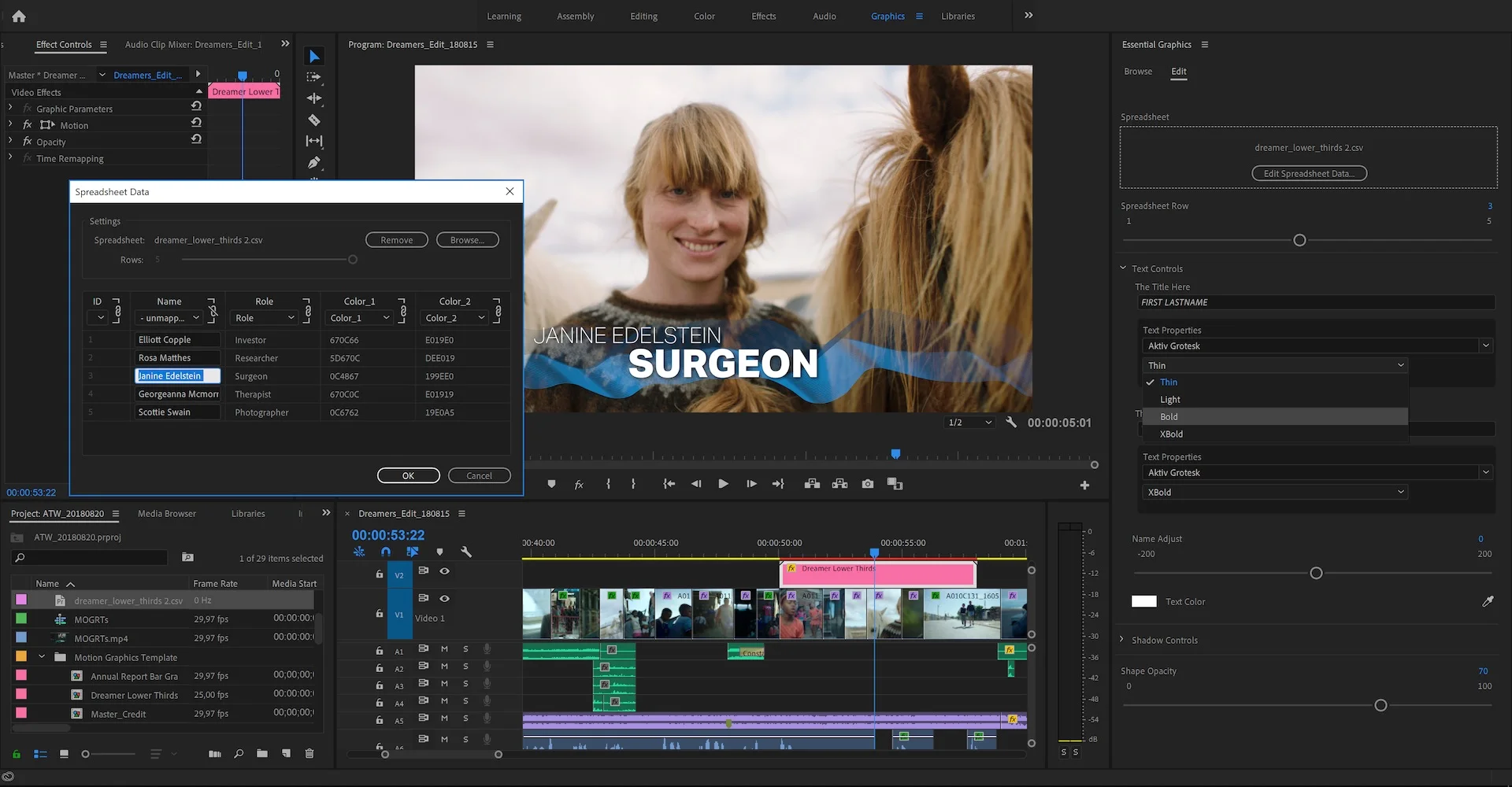 The biggest new feature coming to the Essential Graphics panel is data-driven infographics. Editors can quickly turn spreadsheets into beautiful graphics using Motion Graphics templates created in After Effects. Drag and drop spreadsheets directly in the Essential Graphics panel and the visuals in the Motion Graphics templates will be updated automatically. Not comfortable working with spreadsheets? No worries! Users will be able to customize the selection of spreadsheet data directly in Premiere Pro.